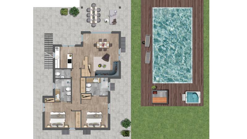 For 2-6 guests, approx. 510 m² (comprising 110 m² of living space and a 400 m² private garden with spacious covered terrace). 2 bedrooms with luxury beds and en-suite bathrooms with shower and bidet, separate toilet, spacious living room with light-flooded dining area, sofa, open-plan kitchen with cooking island, Nespresso coffee machine and tea-making facilities. Smart TV with streaming function. Outdoor area with large garden, private pool (10x4 m), private sauna, whirlpool and comfortable relaxation areas. Underground parking at the main resort.