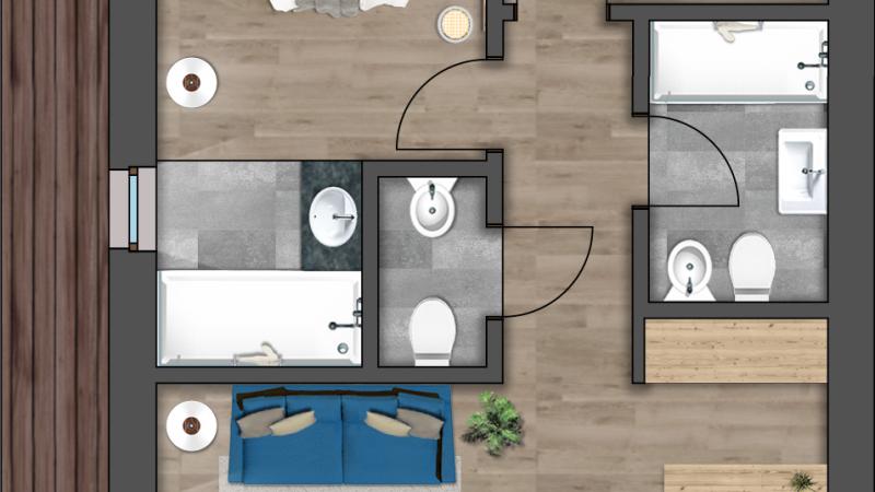 Env. 70 m², pour 2–6 personnes, 2 chambres double avec lit boxspring, 2 salles de bain avec douche spacieuse, WC indépendants avec bidet, grande salle de séjour avec canapé convertible, télévision, minibar, machine à café "Nespresso" et coin thé, climatisation, plancher en bois et grande terrasse/balcon (rez-de-chaussée/ 1er étage).