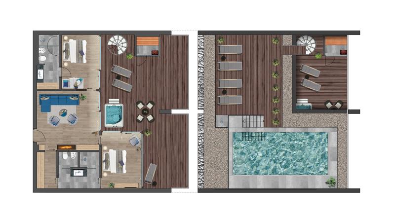 Su 2 piani, 1 camera con letto king-size, 1 camera con letto king-size e letto singolo, cabina armadio, soggiorno con divano, 3 Flat-TV, 2 bagni con doccia a pioggia & bidet, macchina da caffè "Nespresso" e angolo del tè, Minibar, pavimento in legno, vista giardino, divano dondolante sulla terrazza, idromassaggio, sauna privata e piscina infinity.